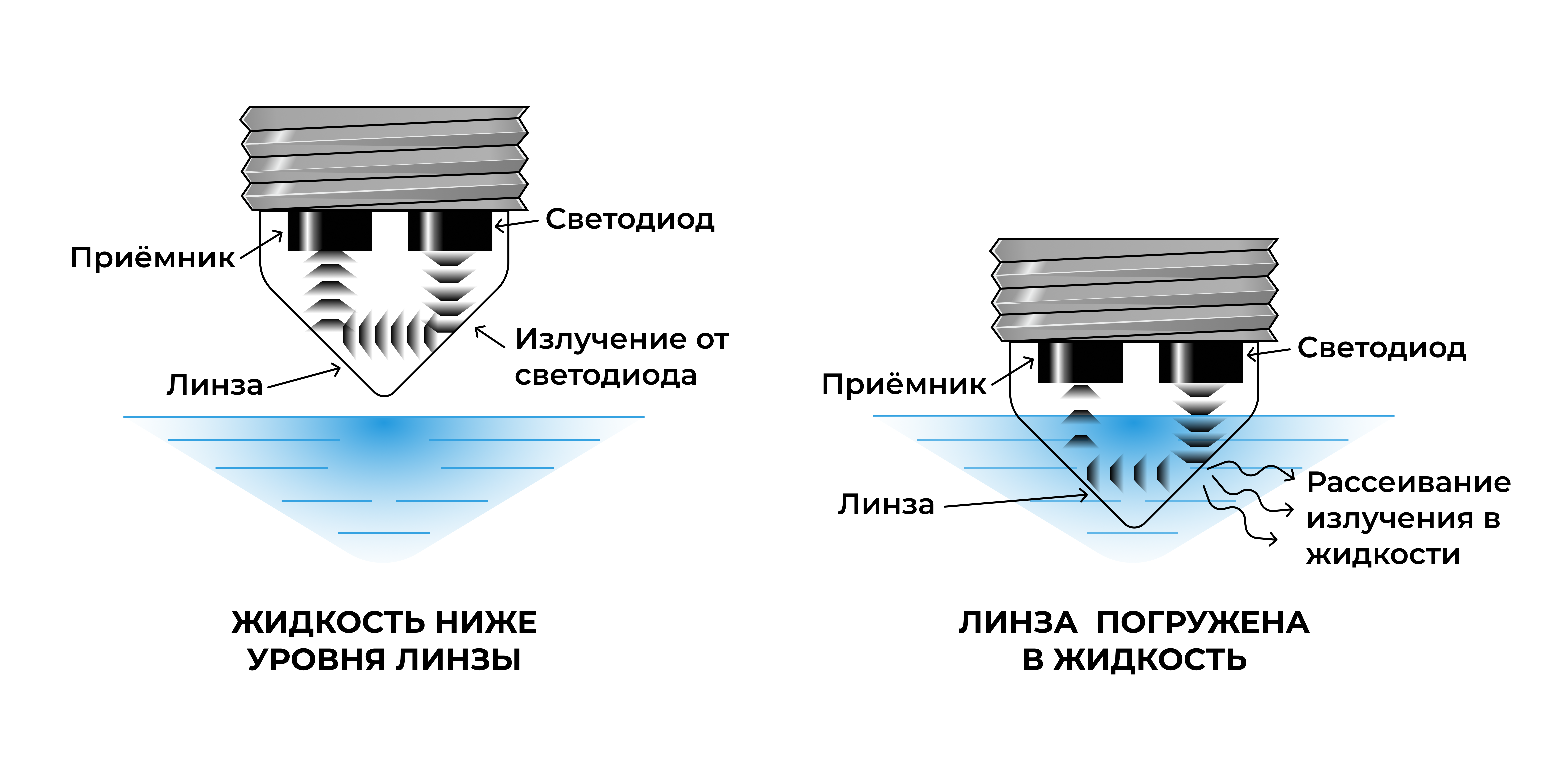 При погружении линзы в нефтепродукт изменяется коэффициент преломления света. Излучение рассеивается в жидкости, и на приёмник попадает значительно меньше света. Датчик определяет наличие жидкости и передаёт сигнал в систему мониторинга.
